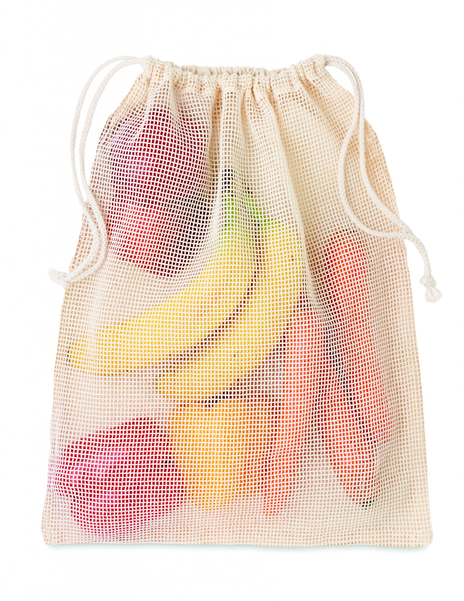 Wiederverwendbarer Netzbeutel für Obst/Gemüse. Eine Seite aus Baumwolle (140g/m²), die andere aus Mesh-Baumwolle (110g/m²). Kordelzug.