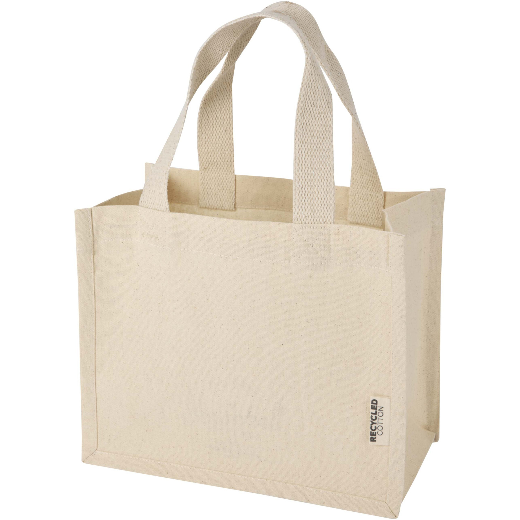 Die Mini-Odessa-Tragetasche mit Bodenfalte aus 100 % GRS-zertifizierter 220 g/m² Recyclingbaumwolle ist mit 35 cm langen Henkeln und einem Hauptfach mit Bodenfalte für bequemes Tragen ausgelegt. Ideal für ein Tablet, ein Buch oder ein paar wichtige Alltagsutensilien. Diese kompakte Tasche ist die perfekte Wahl für schnelle Besorgungen oder den entspannten Stadtbummel. Die verfügbaren Druckmethoden sind ebenfalls GRS-zertifiziert und gewährleisten eine transparente, zertifizierte Lieferkette. Hergestellt in Indien.