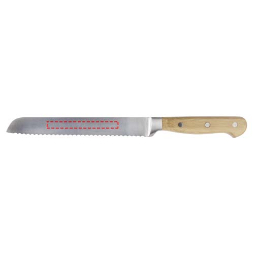 Bambus-Schneidebrett inklusive Brotmesser mit Bambusgriffen. Das horizontal offene Muster lässt Krümel auf das darunter liegende Tablett fallen und hält Ihren Arbeitsbereich oder Esstisch krümelfrei. Messergröße: 34 cm x 3 cm. Der Bambus wurde nach nachhaltigen Standards beschafft und produziert.