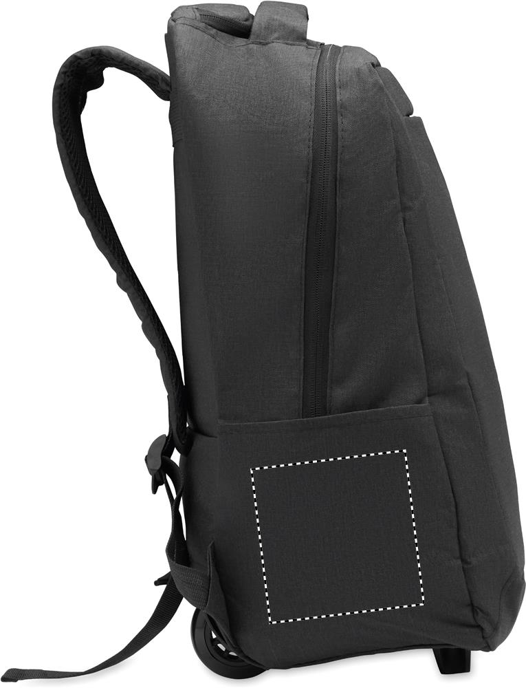 Laptop backpack trolley with wheels in 600D RPET polyester. Includes one internal 15 inch laptop compartment. Zippered front pocket. Two side slip pockets. Three inner slip pockets. Padded back and shoulder straps. 2 wheels and double tube frame.