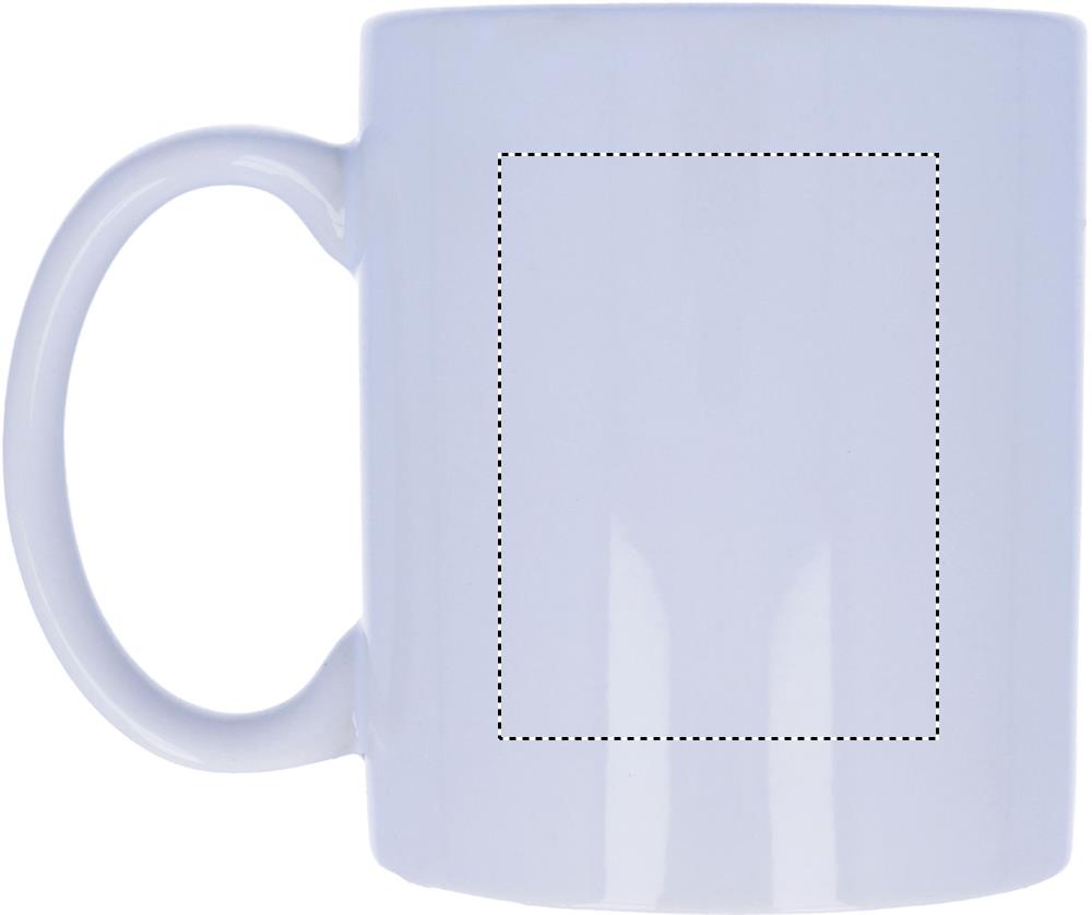 Classic cylindrical ceramic mug of 300 ml mug. Individual packaging in corrugated carton gift box. For full colour process printing, please contact us for pricing.