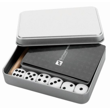 Travel set of a playing cards and a dice in a tin box. You will certainly welcome this set, for example during your camping trip, when you and your friends will be able to enjoy the evening with a fun game or just at home with your family. The set includes 54 playing cards with a water repellent surface treatment, 6 dice, 15 note papers and a pencil.