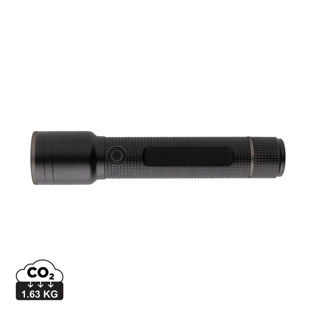 Functionality, performance and design all come together in this re-chargeable 10W torch made with RCS certified recycled aluminum. Total recycled content: 20% based on total item weight. RCS certification ensures a completely certified supply chain of the recycled materials. Because of its IP4 rating, it is weatherproof so can easily be taken outside. The powerful bulb creates up to 800 lumen and a beam that reaches up to 500 metres. The torch uses a re-chargeable A-grade battery so no need to replace the batteries. Simply re-charge via your USB socket and the included RCS certified recycled type C cable. The high quality bulb comes with 5 modes including SOS function. The 2000 mah battery allows a usage up to 8 hours on a single charge and also allows charging your mobile devices via type C. Aluminum does not lose its characteristics in the recycling process and can be recycled endlessly. Item and accessories 100% PVC free. Packed in FSC mix packaging. Input Type-C 5V, 1A; Output 5V.