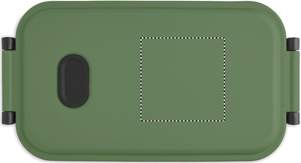 Recycled PP lunch box with airtight lid, silicone valve and two side buckles. Capacity: 800 ml.