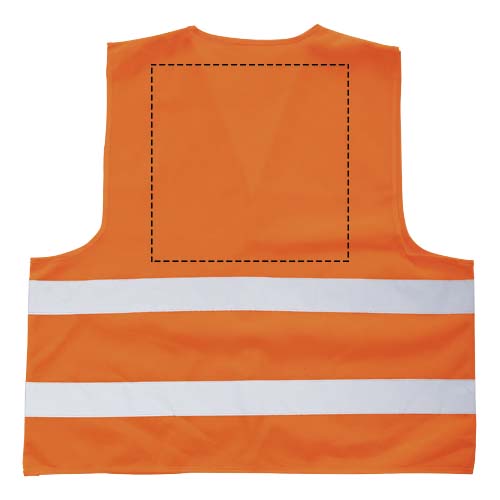 High visibility warning vest Class 2, suitable for persons between 165-180 cm. Large decoration area on the front and on the back of the vest. Visibility clothing for professional use. Fluorescent background and reflective tape. Specification EN ISO 20471:2013+A1:2016. These garments bear CE marking to demonstrate compliance with EU Regulation 2016/425/EU Personal Protective Equipment Category II.