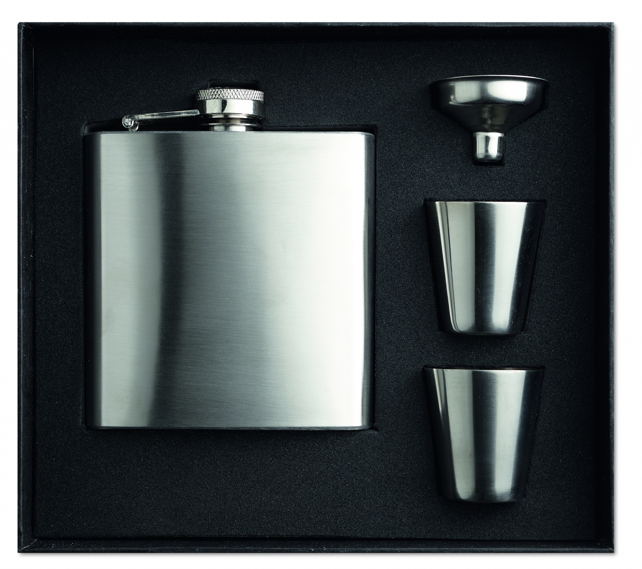 Slim hip flask. Satin finish, single layer 175 ml. With 2 cups and bottleneck, presented in a black gift box.
