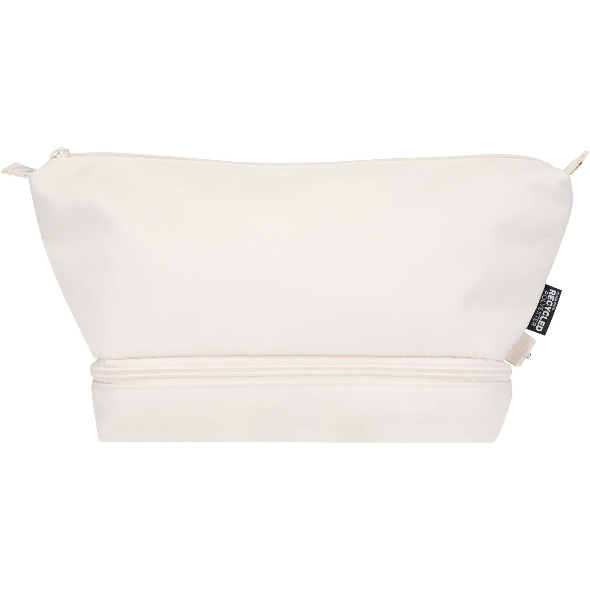 The Trip Aware™ recycled travel toiletry bag is a compact, structured bag designed to keep personal items neatly organised while travelling. Made from 290D twill polyester with a knitted backing and lined with RPET 210D/PU, it features a clean layout with practical compartments. The main compartment includes an internal zip pocket for smaller items, while the clamshell-style bottom compartment keeps essentials separate for easier access and improved organisation. Each bag also comes with an Aware™ tracer. This innovative feature allows users to trace the origins and journey of their item through a QR code, enhancing transparency in the supply chain and fostering a stronger connection between the product and its production process. Volume capacity: 6 litres.