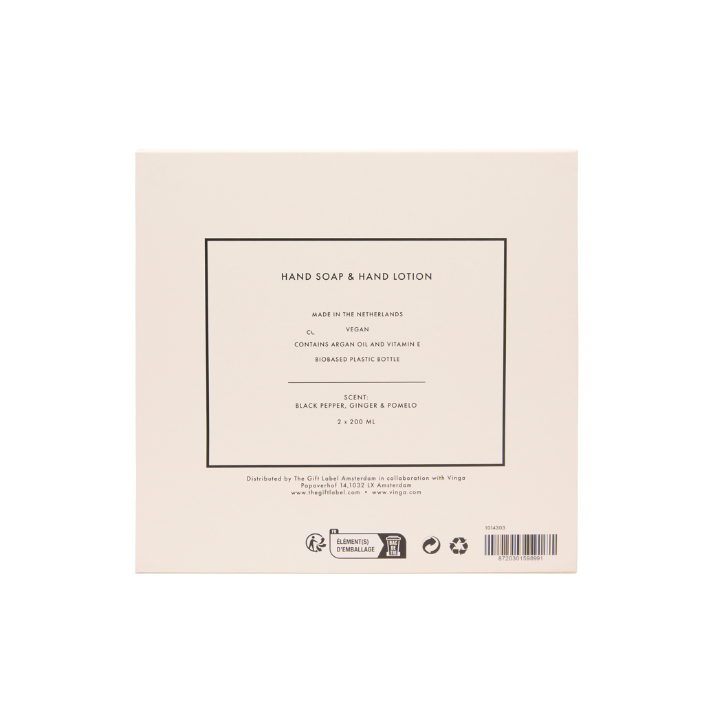 Silky smooth hands, every day. Take care of your hands with this beautifully scented set, featuring two 200 ml bottles of hand soap and hand lotion. With the warm, zesty aroma of black pepper, ginger and pomelo it leaves your hands feeling smooth, nourished and subtly fragranced. A touch people will remember. Elegantly packed in a giftbox in cream white and black.