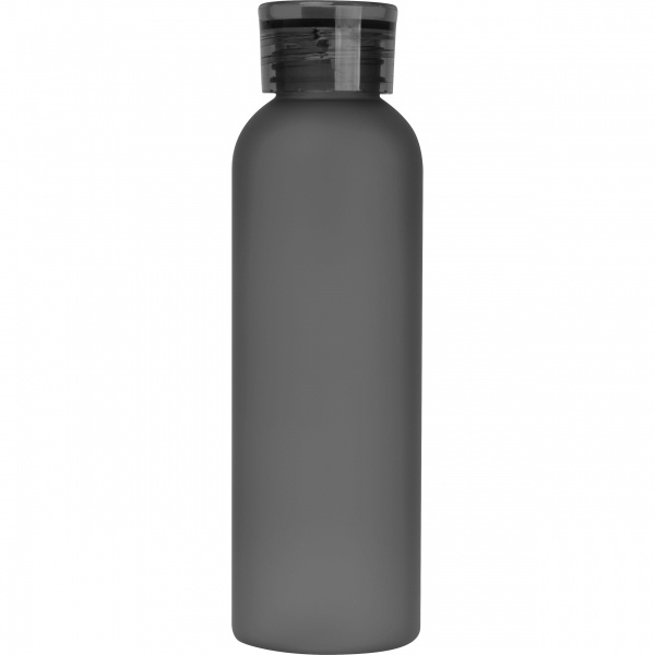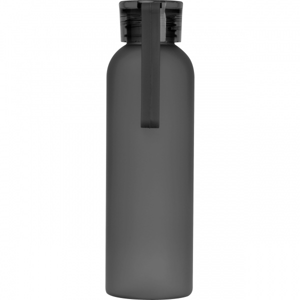 Drinking bottle made of PET with a rubber carrying handle on the lid and a capacity of 600 ml. The frosted surface of the bottle provides a particularly pleasant feel. Your logo is printed on the bottle.