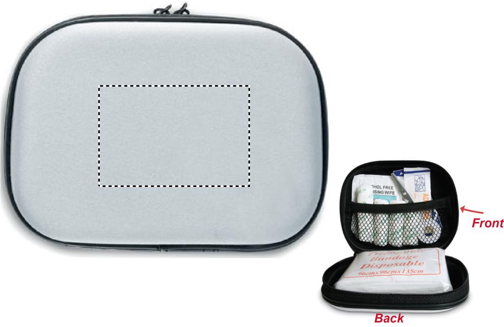 EVA materjalist esmaabikomplekt. Kaasas 1 paar kääre, 3 padjakest, 1 kolmnurkside, 1 rull vati, 2 puhastuslappi, 5 kleepuvat sidet, 1 rull teipi ja 6 vatitupsu.