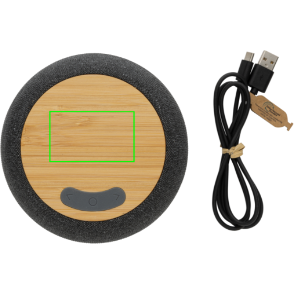5 W juhtmevaba kõlar kristallselge heliga. Valmistatud FSC® 100% bambusest, RCS (Recycled Claim Standard) sertifitseeritud ringlussevõetud ABS ja PET. Taaskasutatud kogusisaldus: 51% eseme kogukaalust. RCS-sertifikaat tagab taaskasutatud materjalide täielikult sertifitseeritud tarneahela. Kõlar on varustatud 1200 mAh akuga, mis tagab kuni 6-tunnise esitusaja ja BT5.3 sujuva ühenduse ja selge heli. Ühendusulatus kuni 10 meetrit. Mikrofoniga kõnedele vastamiseks. Pakitud FSC® mix kraft karpi. Kaasa arvatud GRS-sertifikaadiga taaskasutatud TPE laadimiskaabel. Toode ja tarvikud 100% PVC-vaba.