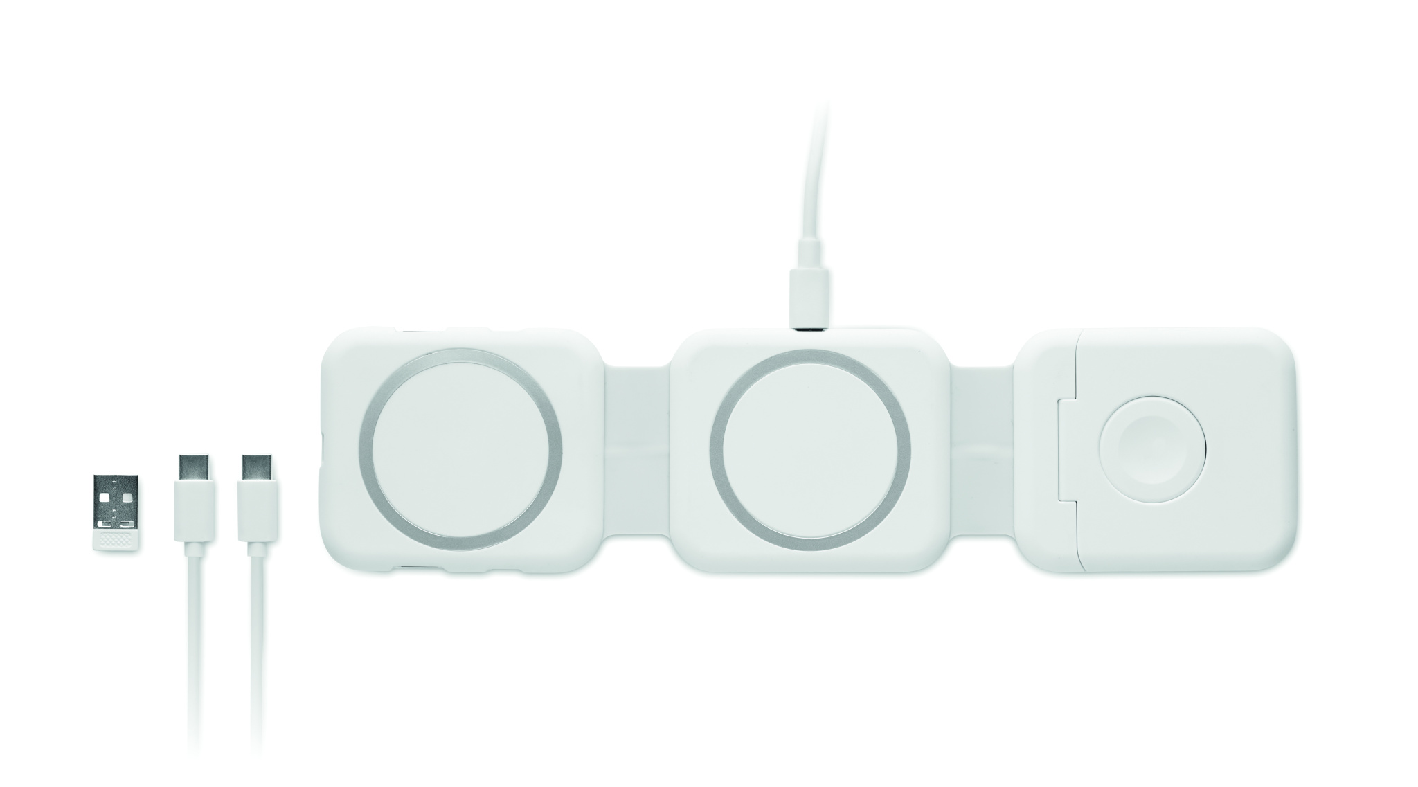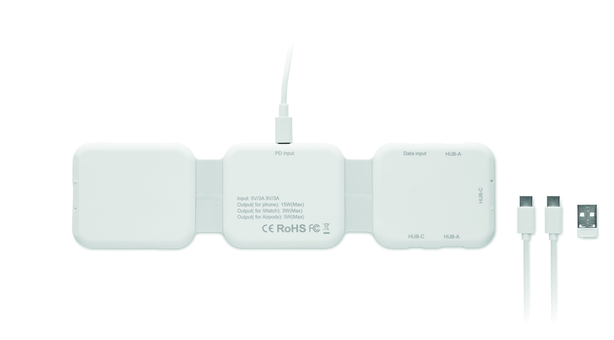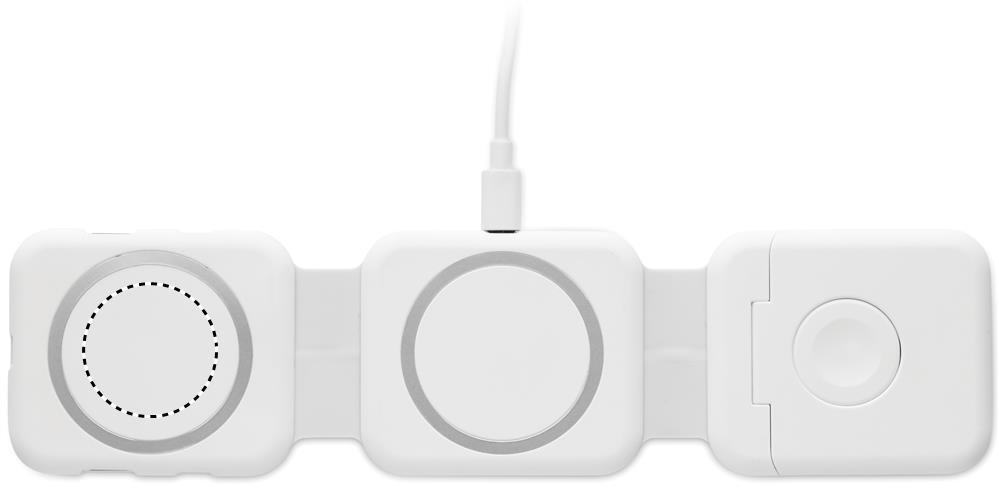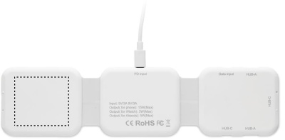 Magnetiline laadimisjaam ABS-plastist. 3 juhtmevaba laadimiskohaga. 1 x 15 W, 1 x 5 W TWS-i jaoks ja 1 Apple Watchi laadija (3 W). 2 Type-C ja 2 USB-A jaoturit. Integreeritud kaabli sisend: Type-C ja USB-A ühenduspesa.