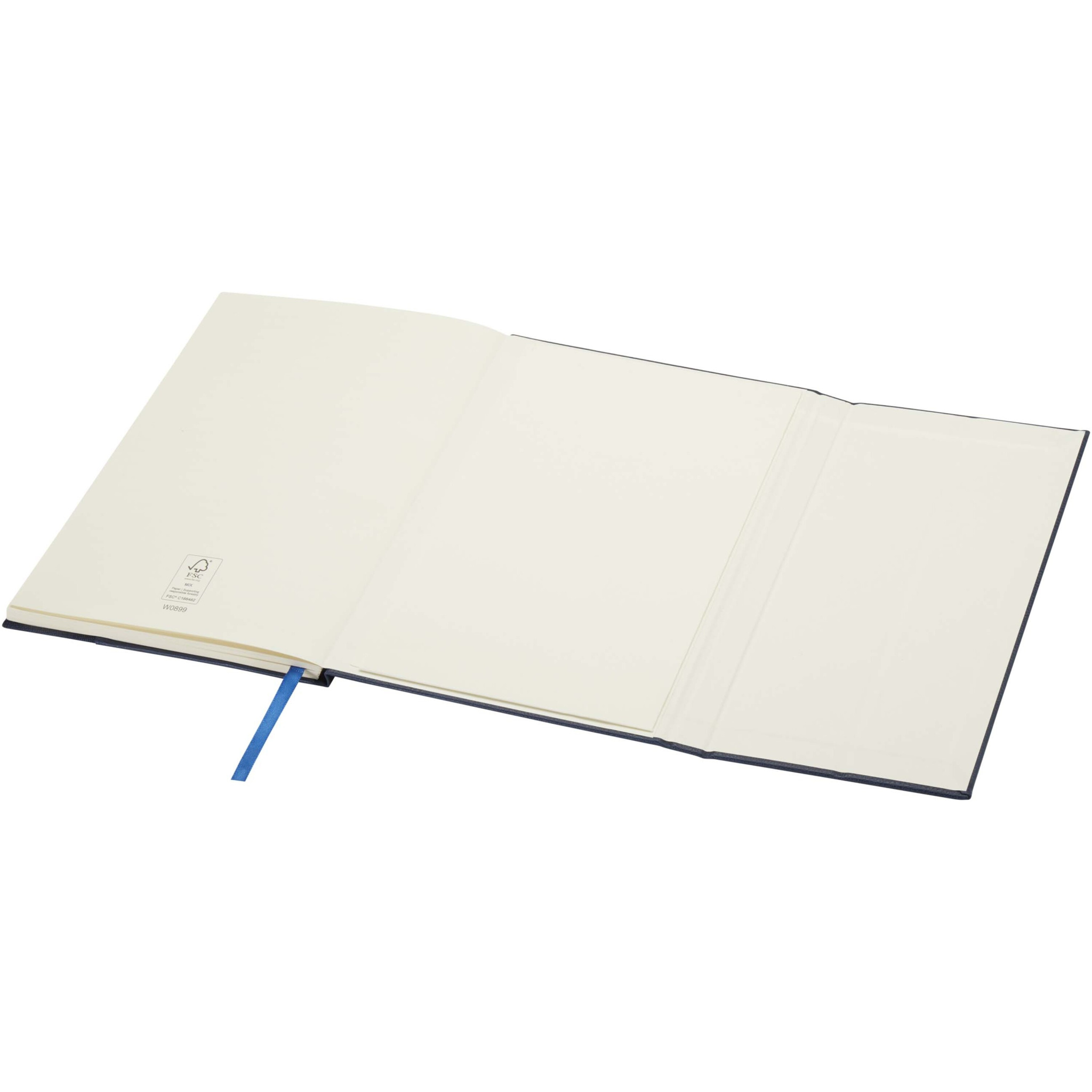 Kovakantinen Alejandra A5-muistivihko on valmistettu kierrätetystä PU-muovista ja RPET:stä, ja siinä on 80 viiva-arkkia 70 g/m²:n kermanväristä paperia, kirjanmerkkinaru ja haitaritasku.