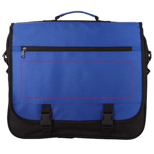 Laukku, jossa on säädettävä olkahihna, kiinnityssolki, läpässä vetoketjullinen tasku, vetoketjullinen säilytyslokero ja läpän alla useita avoimia taskuja.