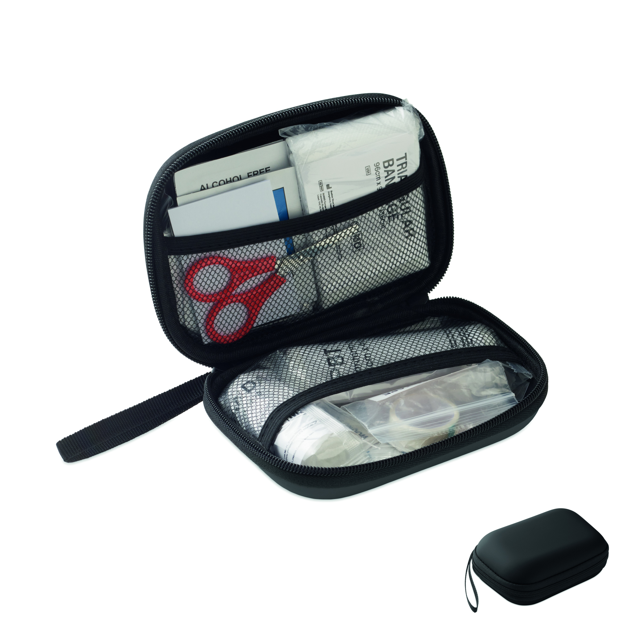Ensiapulaukku kovassa PU-kotelossa. Sisältää 2 käsinettä, 1 peiton, 1 teipin, 2 sidettä, 1 sakset, 4 vanupuikkoa, 10 laastaria ja 6 puhdistusliinaa. Ei saatavilla EU:n ulkopuolelle.
