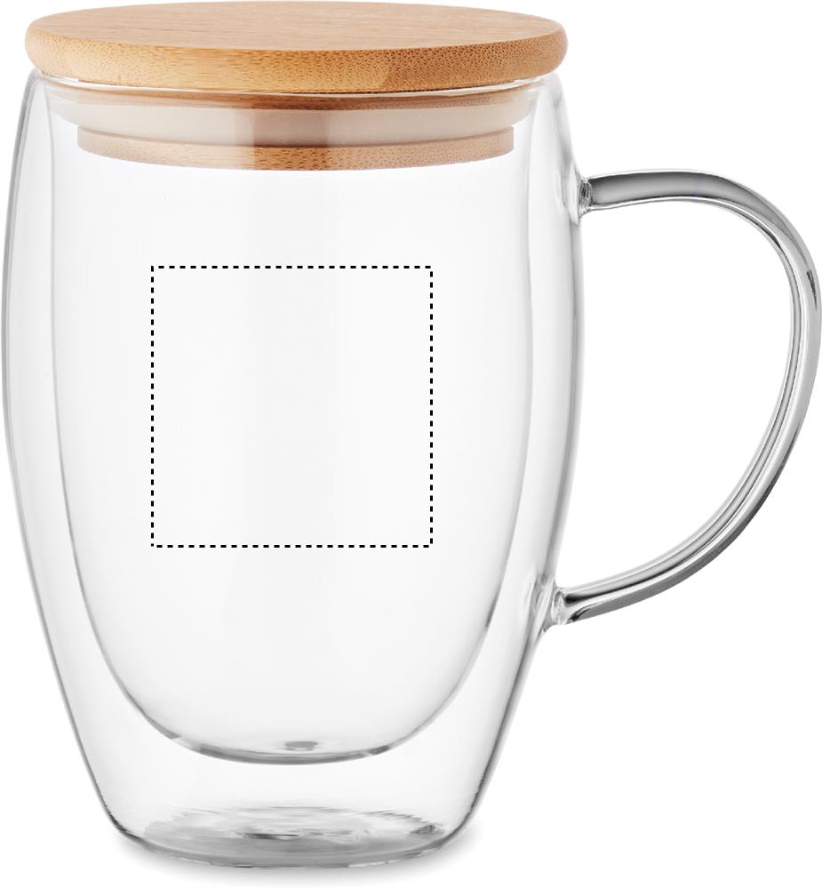 Kaksiseinäinen borosilikaattilasimuki kahvalla ja bambukannella. Tilavuus: 300 ml.