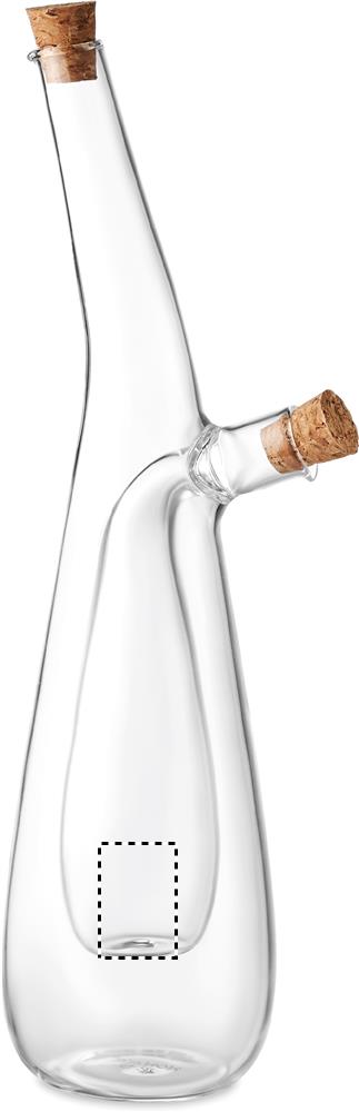 Borosilikaattilasista valmistettu öljy-/ etikkapullo, korkista valmistetulla korkeilla. Ulkoisen pullon tilavuus 300ml ja sisäisen- tilavuus 80 ml. Borosilikaattilasiin ei voi kaiverruttaa.