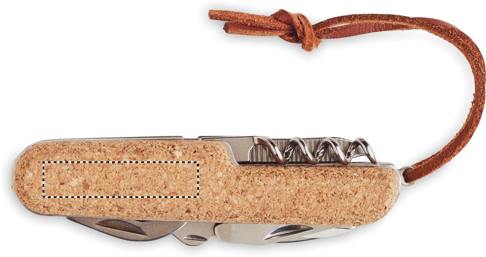 Ruostumattomasta teräksestä valmistettu monikäyttöinen taskuveitsi, jossa on korkkipäällyste ja PU-naru. Sisältää 2 avaajaa, veitsen, sakset, ruuvimeisselin Philips-kärjillä, viilan ja korkkiruuvin.