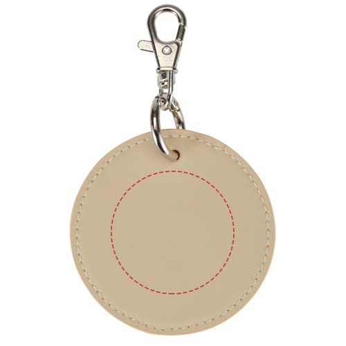 Ensiluokkaisesta kierrätetystä PU-nahasta valmistettu pyöreä, klipsillä varustettu riipus lisää hienostuneen ilmeen arkiasusteisiisi. Sen halkaisija on 7,5 cm:n kokoinen ja se on täydellinen koriste laukulle tai avainnipulle. Kevyt mutta kestävä riipus kiinnittyy vaivattomasti, ja siinä yhdistyvät hillitty tyyli sekä vastuullisempi materiaalivalinta.