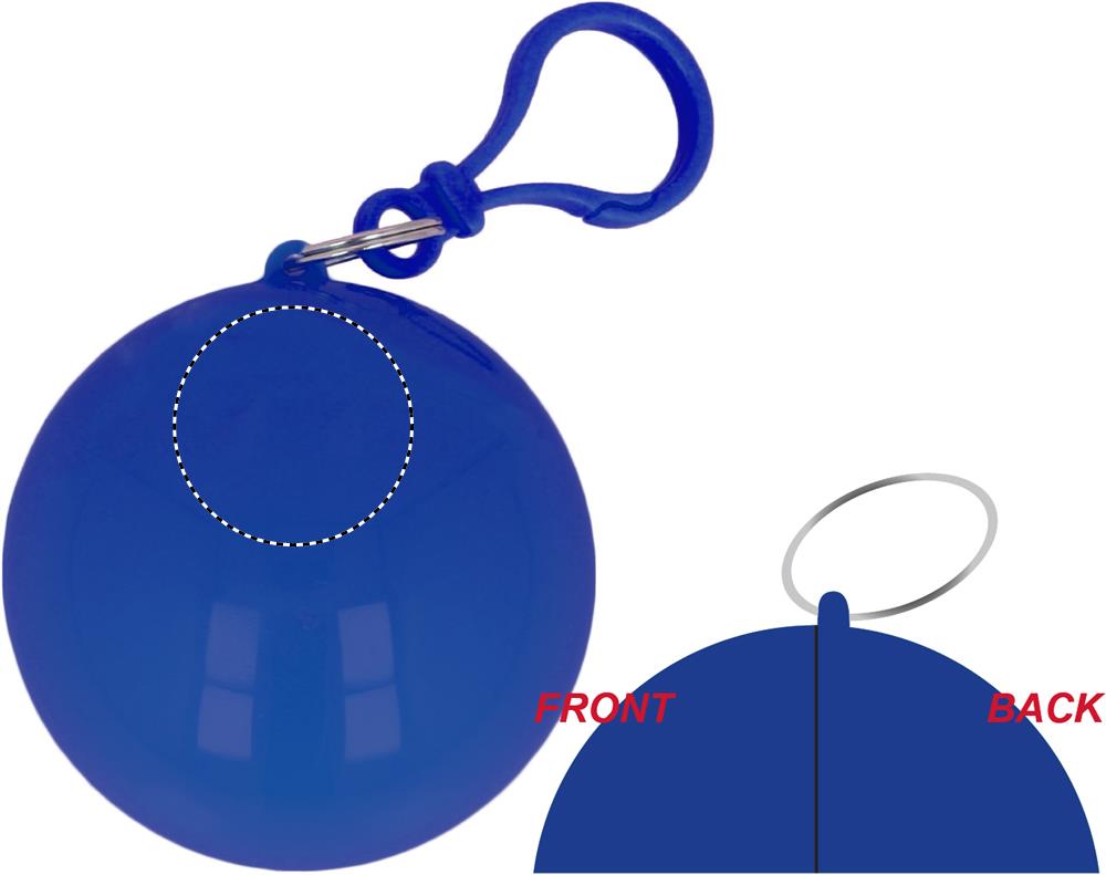 Läpinäkyvä PE-sadeviitta pakattuna AS-muovi palloon. Pallossa karabiinikouku, karabiinikoukkua ei ole tarkoitettu kiipeilyyn.