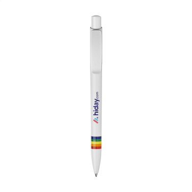 Stilolinea® kuulakärkikynä, jossa on sininen muste, valkoinen kiillotettu piippu, työntöpohja ja runsas solki. Tynnyrissä on kirkkaanväriset renkaat näyttävää muotoilua varten. Valmistettu Italiassa.