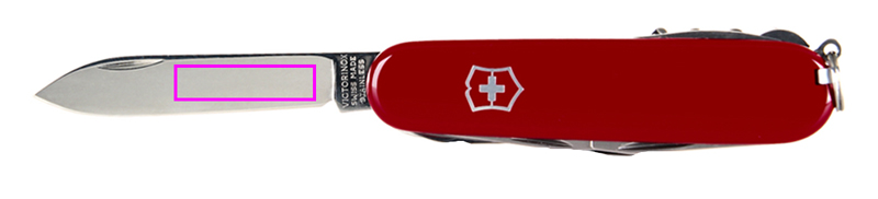 ominaisuudet: 1. iso terä 2. kynsiviila kynsi: 3 - laite kynsien puhdistamiseen 4. korkkiruuvi 5. tölkinavaaja jossa: 6. - pieni ruuvimeisseli 7. avaajakorkit: 8. - ruuvimeisseli 9. - langanpoistaja 10 vartaat 11. avaimenperä 12. pinsetit 13. hammastikku.