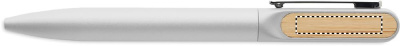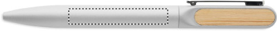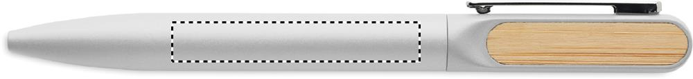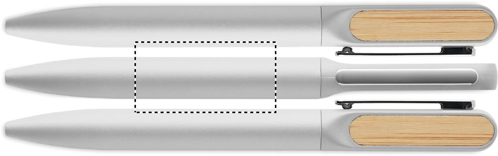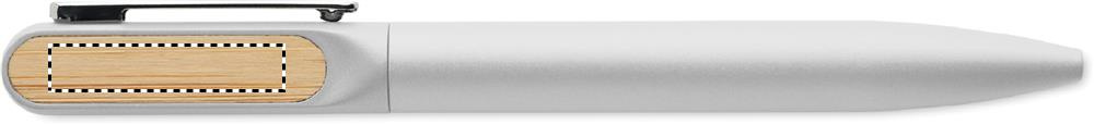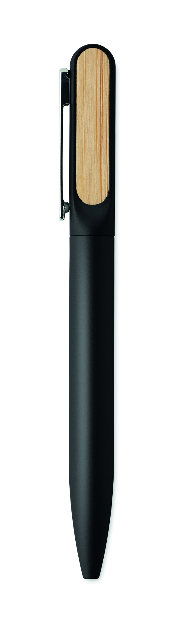 Kierrettävä kuulakärkikynä, jossa kierrätetystä alumiinista valmistettu runko, kierrätetystä ABS-muovista valmistettu kierreosa ja metallinen klipsi bambuyksityiskohdilla. Sininen muste.