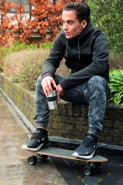Tiivis, tyhjiöeristetty muki on valmistettu kaksiseinäisestä, ruostumattomasta teräksestä, ja siinä on silikonikahva ja liukukansi. Voidaan pestä astianpesukoneessa ja sopii useimpiin kahviautomaatteihin. Sisältö: 300 ml.