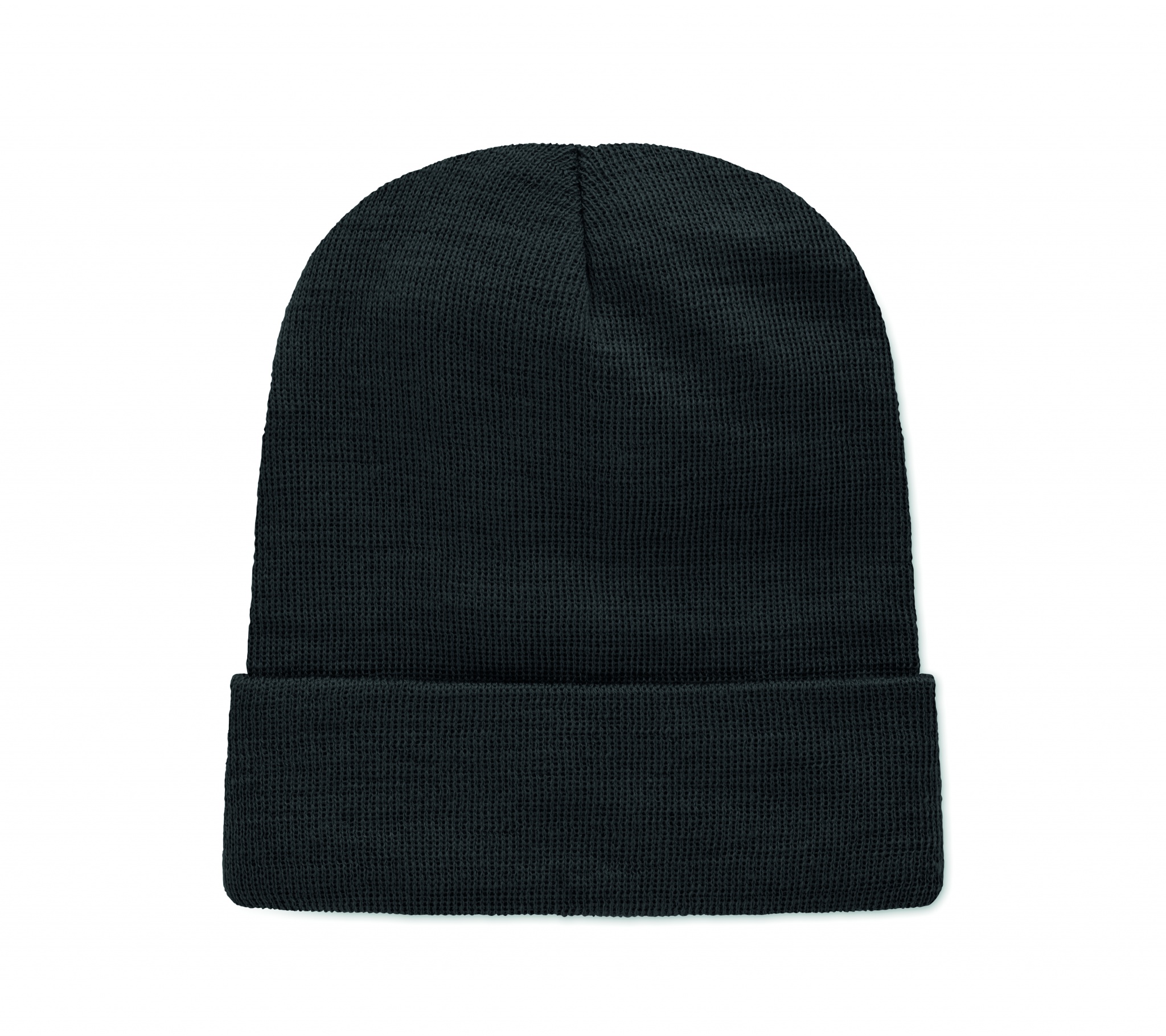 Unisex-neulottu pipo pehmeästä, joustavasta RPET-polyesteristä, jossa on taite ja kangasmerkki painatusta varten.