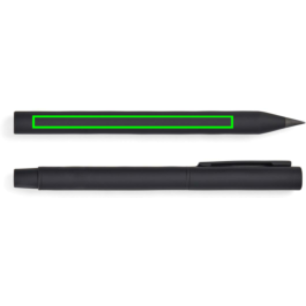 Moderni ja virtaviivainen setti sisältää kaksi kynää: musteettoman, ikuisen kynän ja klassisen kuulakärkikynän, jossa on korkki ja klipsi. Tyylikkäät ja toimivat kynät on valmistettu RCS-sertifioidusta kierrätetystä ruostumattomasta teräksestä. Niiden pinnalla on kumipäällyste, mikä tekee otteesta miellyttävän ja antaa kynille matan ulkonäön. Molemmat kynät ovat tasapainotettuja, mikä tekee niistä vakaita ja kirjoittamisesta vaivatonta. Ikuisella kynällä voi kirjoittaa rajattomasti. Kuulakärkikynässä on 1,00 mm:n kärki, ja sen arkistokelpoisella, sinisellä musteella kirjoitat sulavaa ja tasaista jälkeä jopa 1 200 m. RCS-sertifiointi: RCS (Recycled Claim Standard) -sertifikaatti takaa, että koko kierrätysmateriaalien toimitusketju on sertifioitu. Tuotteen kokonaiskierrätysmateriaalin osuus perustuu tuotteen kokonaispainoon. Tämä tuote sisältää 52 % RCS-sertifioitua kierrätettyä alumiinia ja 10 % RCS-sertifioitua ruostumatonta terästä.