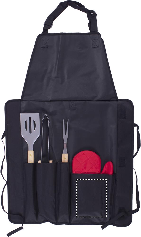 BBQ prijuostė su trimis skirtingais BBQ įrankiais ir viena pirštine. Prijuostė iš 600D poliesterio.