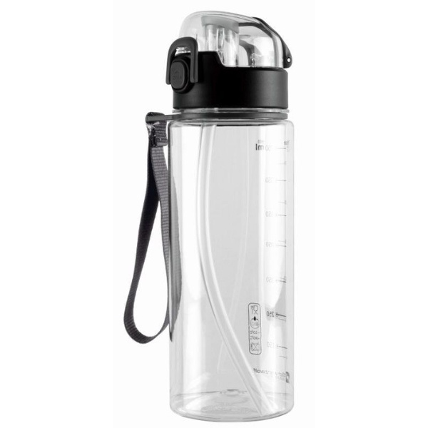 900 ml tūrio sportinis buteliukas iš skaidraus tritano. Buteliukas turi juodą riešo dirželį ir jame nėra BPA. Tinka šaltiems ir šiltiems gėrimams nuo -10°C iki 80°C.