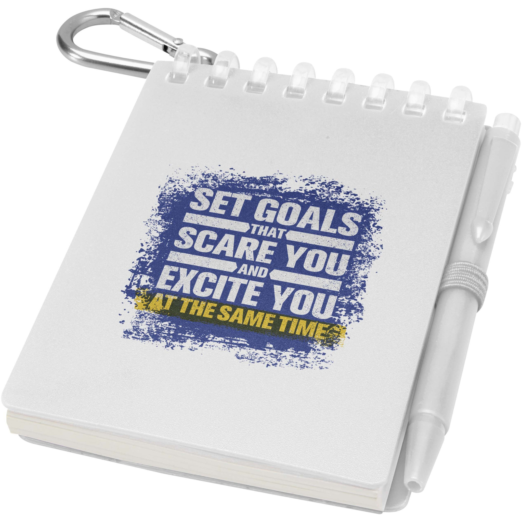 Lig Mini piezīmju grāmatiņas un pildspalvas komplekts ir kompakts un praktisks sabiedrotais piezīmju veikšanai, atrodoties ceļā. Spirālveida piezīmju grāmatiņai ir mīksts pārstrādātas plastmasas vāks un 70 tukšas lapas no 120 g/m² ūdensizturīga akmens papīra, padarot to ideāli piemērotu lietošanai ārpus telpām. Ar noapaļotiem stūriem un iebūvētu pildspalvas cilpu tā atbilst mini izmēra tendencei, vienlaikus saglabājot funkcionalitāti. Pieskaņotā lodīšu pildspalva ir izgatavota no pārstrādātas ABS plastmasas, raksta ar melnu tinti un piedāvā rakstīšanas garumu 250 metri. Krāsā saskaņots metāla gredzens ļauj komplektu viegli piestiprināt pie mugursomas, somiņas vai atslēgu piekariņa, padarot to ideāli piemērotu izturīgai un pārnēsājamai piezīmju veikšanai. Piezīmju grāmatiņas izmērs: 11 × 7,5 cm.