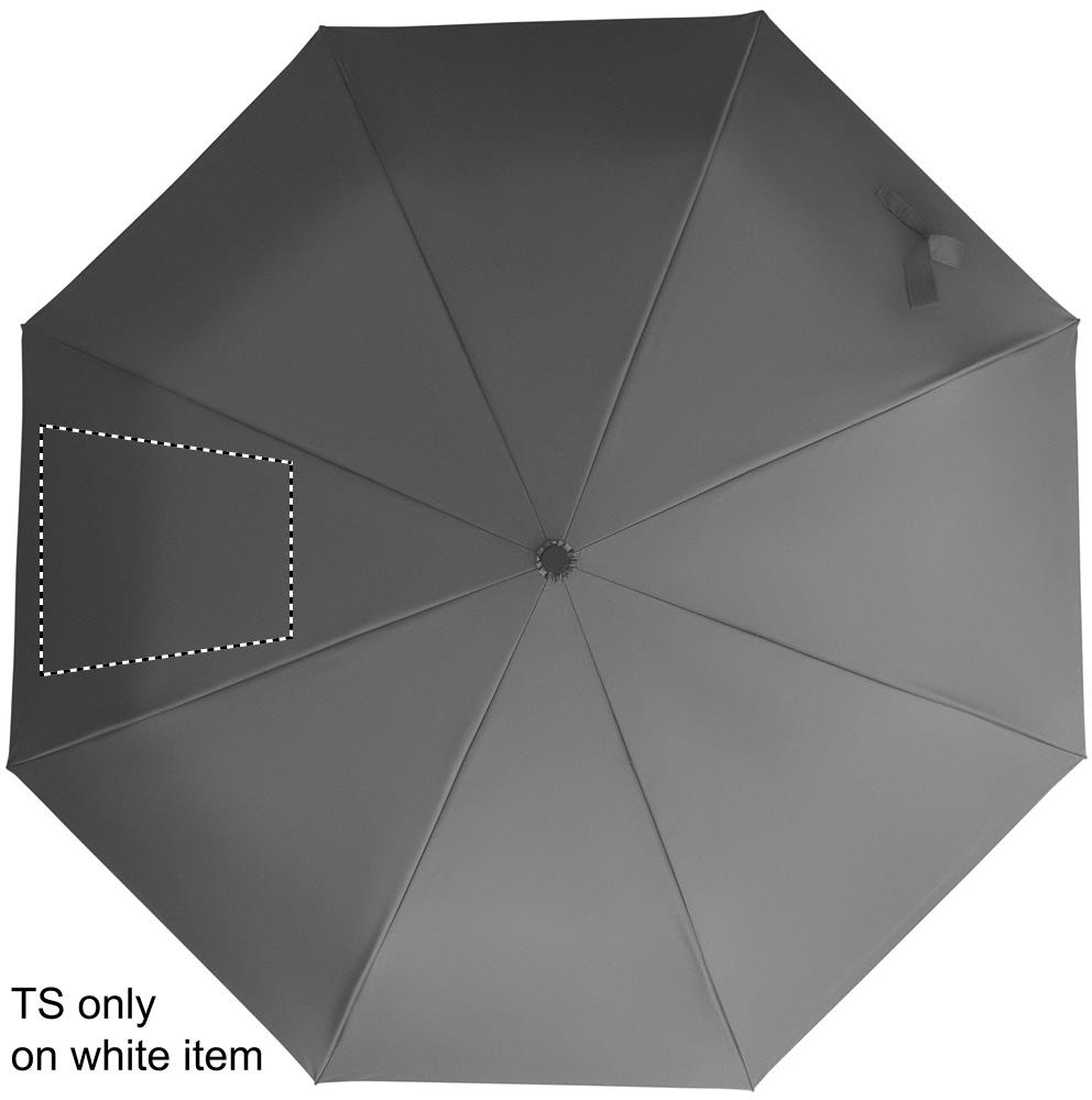 Foldable 21'' windproof umbrella with full black plating fibreglass frame with 2 sections. Fibreglass ribs. 190T RPET pongee panels. D shape carabiner handle w/ rubber finish. Auto open and closure. Includes pouch