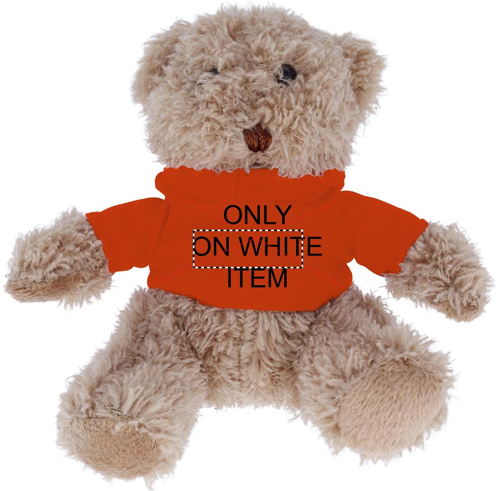 Плюшевый медведь, одетый в хлопковую футболку с капюшоном.