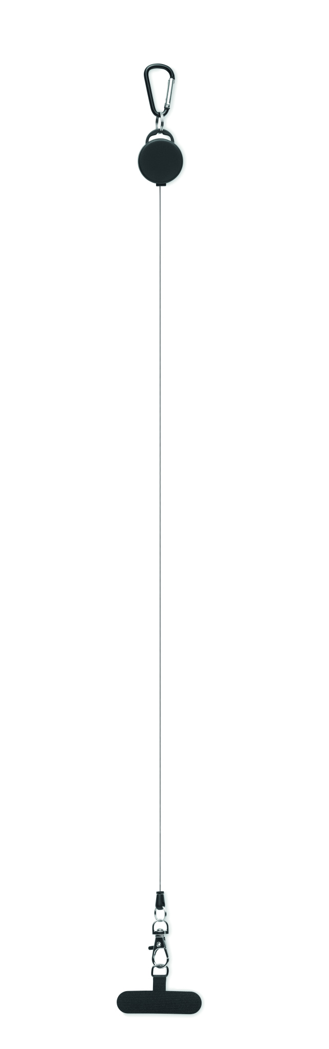 Retractable phone holder and or badge holder in ABS with aluminium carabiner. The carabiner is not for climbing (non-professional use).