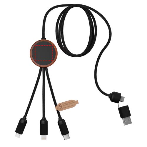 Зарядный кабель 5 в 1 из переработанного PET-пластика со светящимся логотипом и скругленным бамбуковым корпусом Светящийся логотип виден с обеих сторон. Имеет 3 разъема (type C, micro USB, iPhone) и двойной разъем USB для универсального использования. Поставляется в сумке TPU с карточкой из крафт-бумаги. Длина кабеля: 1 метр Гарантия 3 года.