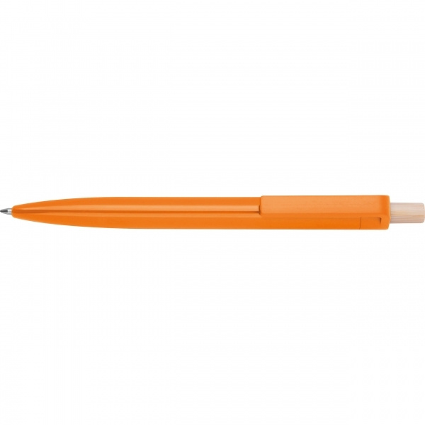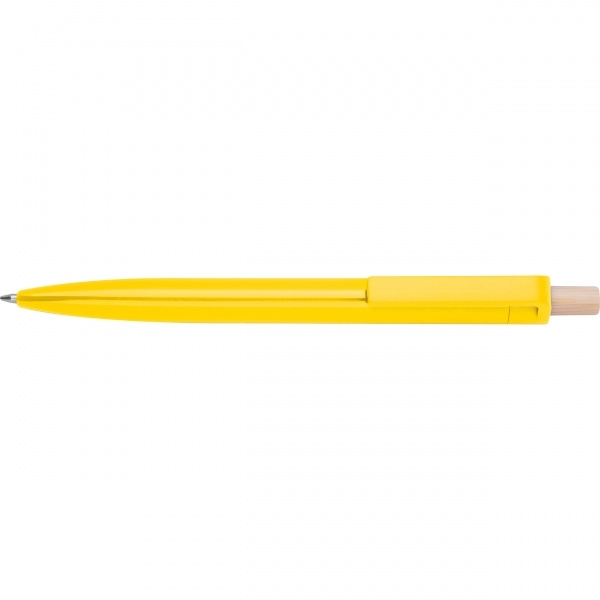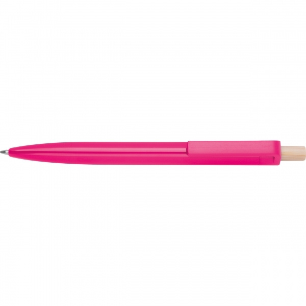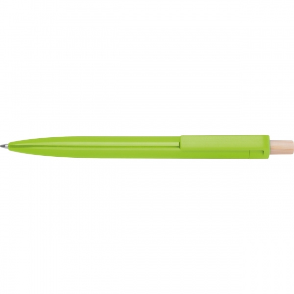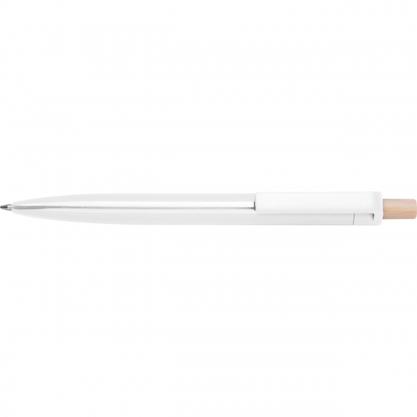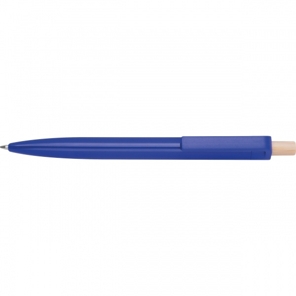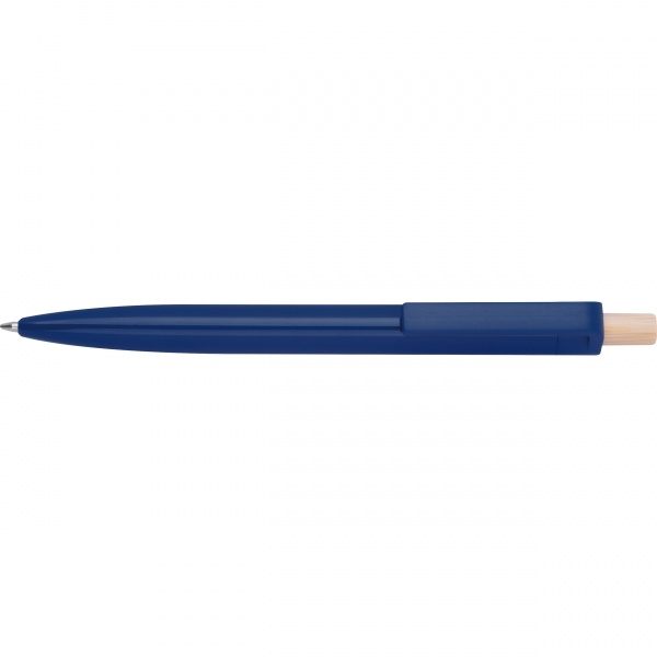 Шариковая ручка из переработанного АБС-пластика с бамбуковой кнопкой. Стержень из пластика синего цвета. Ваш логотип напечатан на корпусе под зажимом.