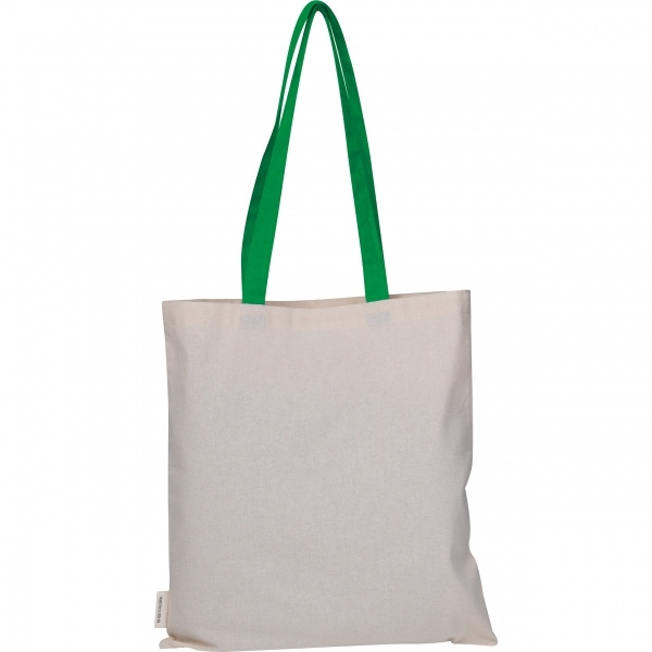 Хлопковая сумка с двумя длинными ручками, изготовленная из 75% переработанного хлопка и 25% переработанного ПЭТ. Плотность ткани: 140 г/м². Ваш логотип наносится на одну сторону сумки.