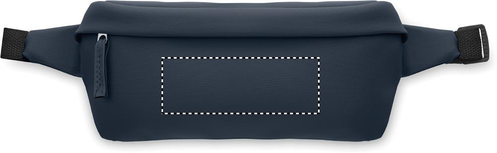Waist bag with PU coated 600D RPET polyester, 210D RPET polyester lining and front zippered pocket.