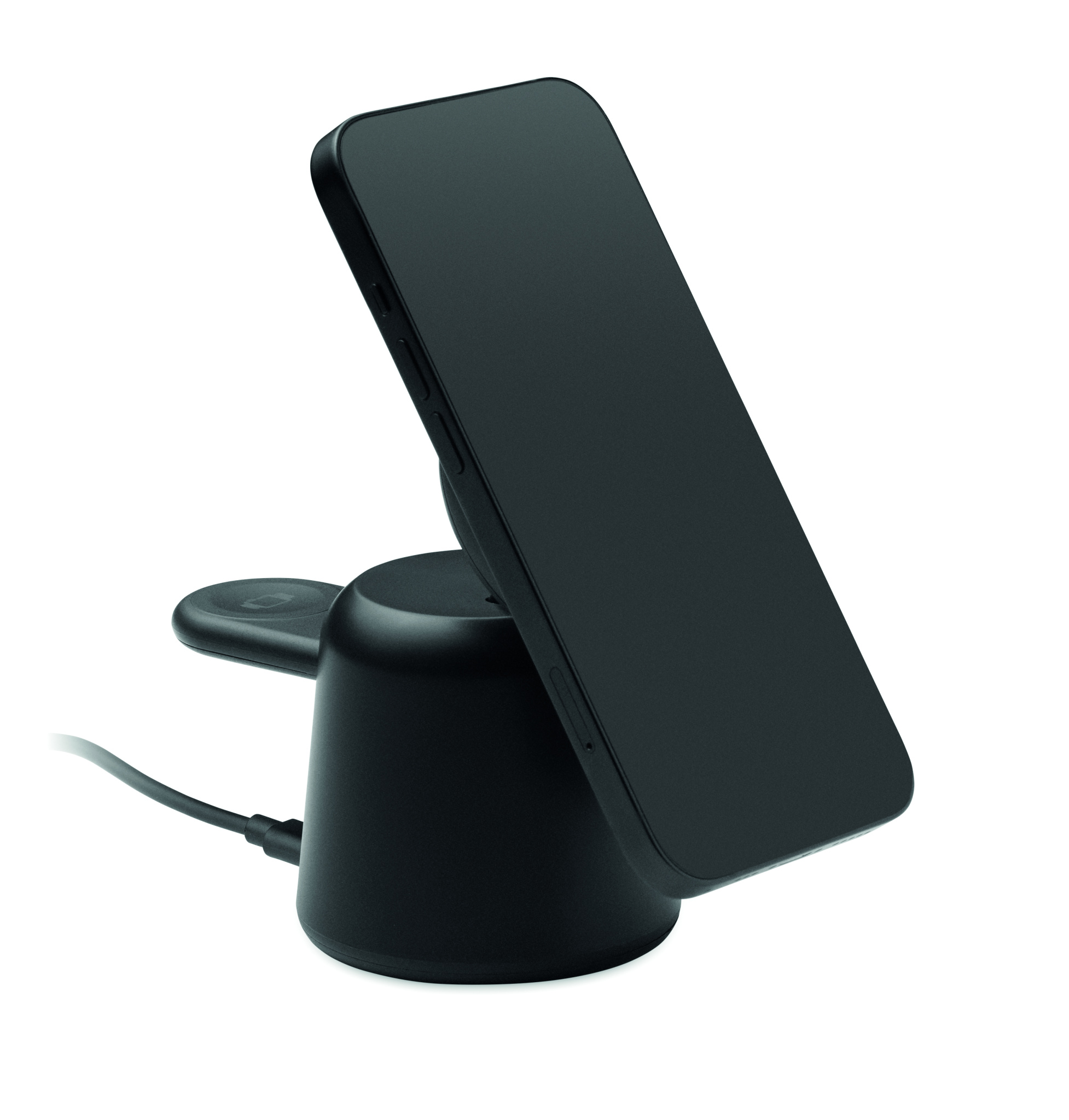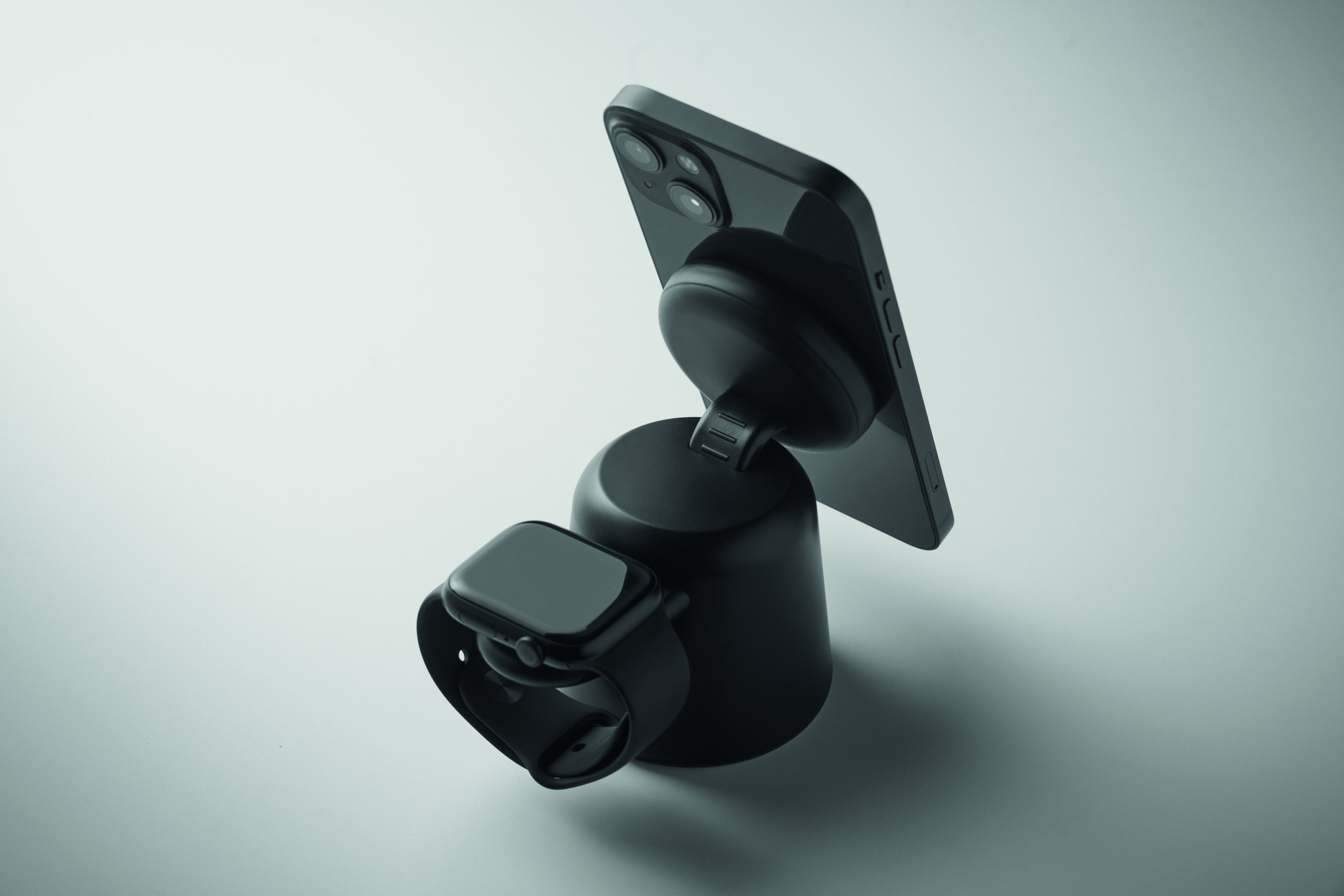 3 i 1 laddstation i ABS. 15W magnetisk trådlös laddare för telefon, TWS samt smartklocka (endast iOS). Magnetfunktionen är komp. med iPhone® 12 och nyare. Inklextra magnetisk metallring för att stödja laddning av andra icke-magnetiska trådlösa laddningsbara telefoner.