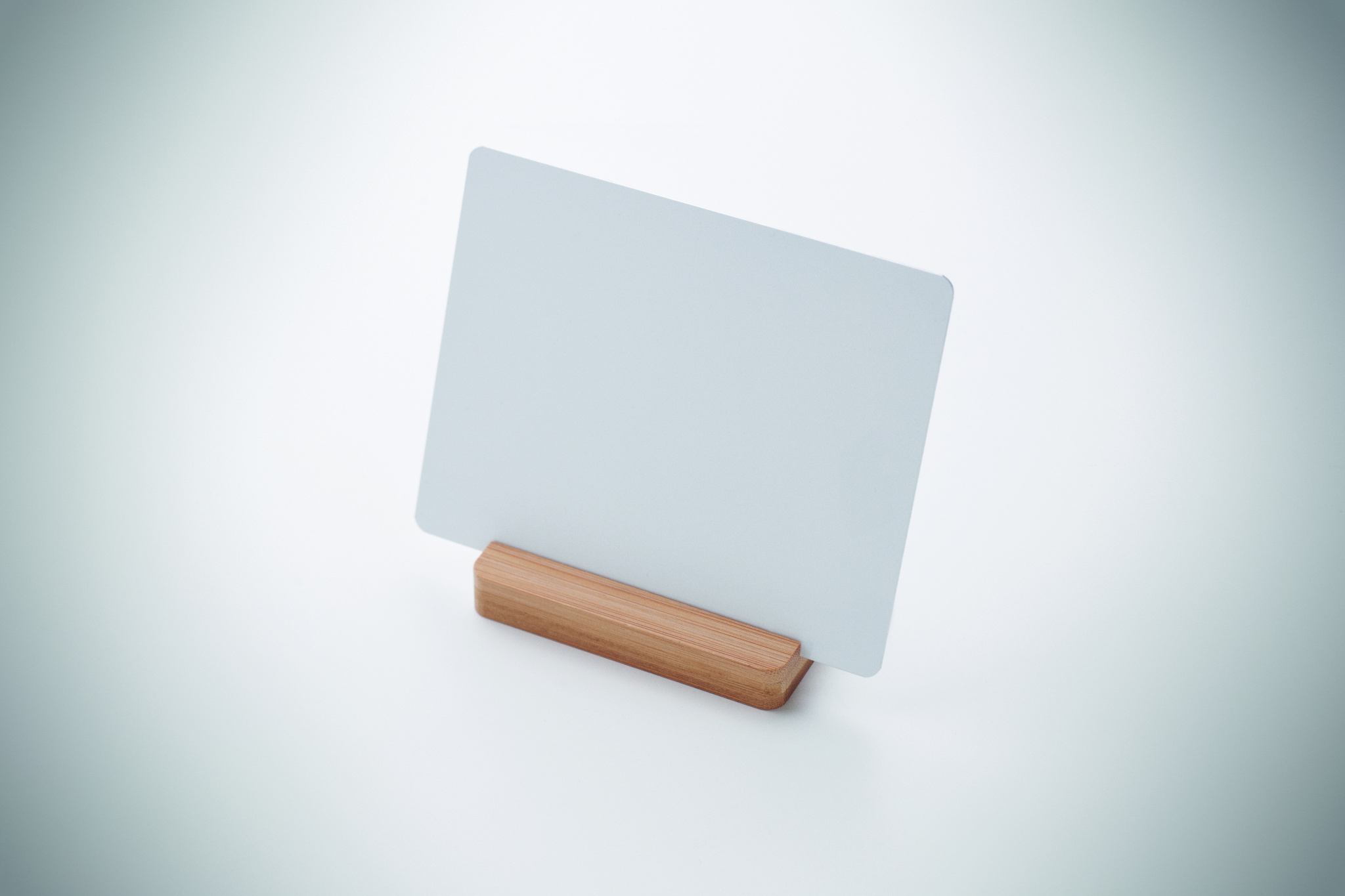 Skylt i aluminium med sublimering och bas av naturlig bambu. Idealisk för anpassad varumärkesprofilering eller display.