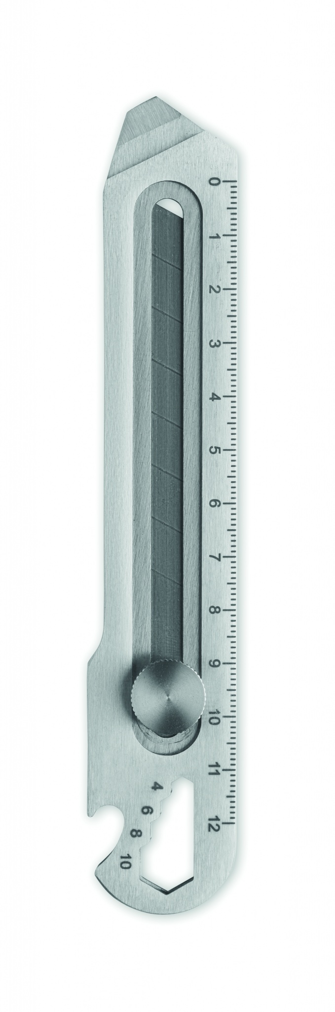 Utdragbar packkniv i rostfritt stål med 8 blad i kolstål, flasköppnare, skiftnyckel och linjal.