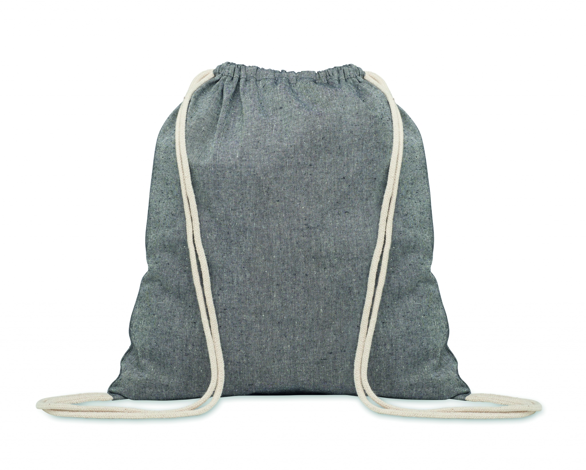 Påse med dragsko i återvunnen bomull (80 % återvunnen bomull, 20 % vanlig bomull). 140 gr/m².