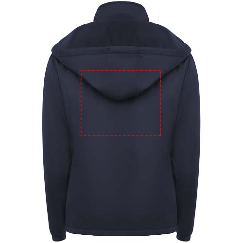 Lätt vattentät jacka. Hög krage och vikbar huva med dragsnodd. Foder i mikrofleece. Dragkedja fram och hakskydd. Elastiska muddar. Två sidfickor med dragkedja. Invändig bröstficka på vänster sida. Borttagbar etikett. Vattentät. Vindtät. Den manliga modellen är 184 cm och bär storlek L, den kvinnliga modellen är 174 cm och bär storlek S.
