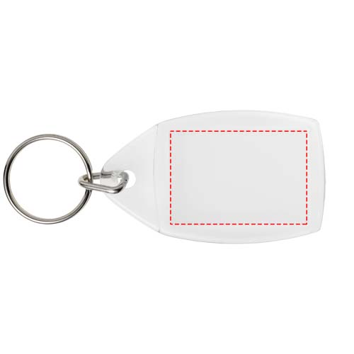 Genomskinlig nyckelring med delad metallring. Metallringen har en platt profil som är idealisk för utskick. Tryckinläggets dimensioner: 3,5 cm x 2,4 cm.