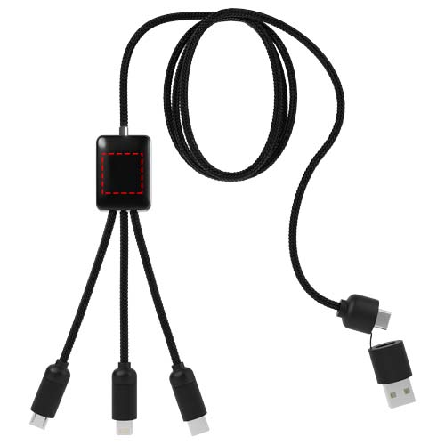 Laddningskabel med finish i gummi och metall och upplyst logotyp. Utrustad med tre kontakter (Typ-C, Android, iPhone) och USB-A och USB-C-utgång. Upp till tre enheter kan laddas samtidigt. Längd på kablar (inkl. kontakter): 10 cm. Total kabellängd: 1 meter. Kabeln är tillverkad av återvunnen PET plast och förpackningen av återvunnet papper och återvunnen plast.