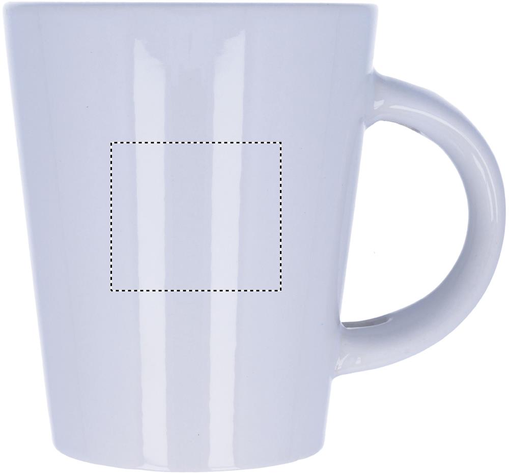 Mugg i stengods med sked. Koppen rymmer 300 ml och har en särskild beläggning för sublimeringstryck. Med sublimeringstryck kan du trycka bildmotiv som tål maskindisk runt hela muggen. Levereras i vit presentkartong.