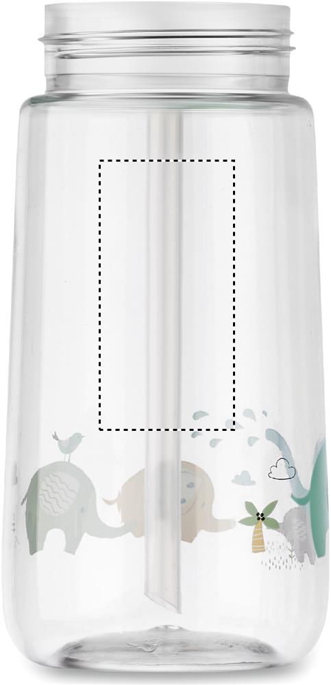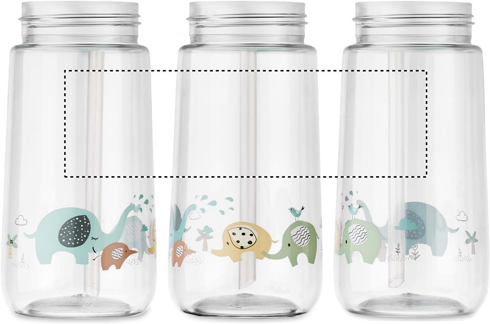 Flaska för barn i tritan med inbyggt sugrörslock. Mönster tryck på flaskans nedre del. Läckagefri. Kapacitet: 450 ml.